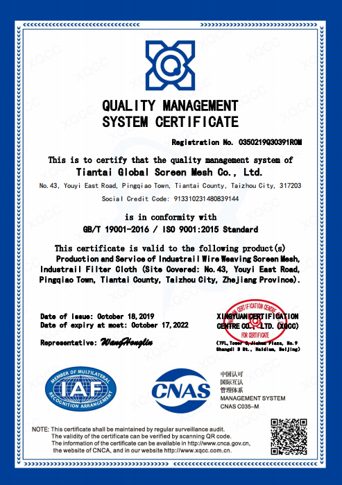 天臺環球篩網有限公司,成立于1995年,座落在東海之濱美麗的天臺山腳下,注冊資金500萬人民幣,公司已通過ISO9001:2015國際質量體系認證。經過環球人的不斷努力,目前公司已擁有標準廠房10,000平方米,各種篩網設備近100臺,員工100余人,其中高中級科研及管理人員10人,公司產品主要有:不銹鋼網,銅網,電焊網,電焊網片,軋花網,不銹鋼延伸產品,單復絲濾布,濾布袋,壓濾機袋等。